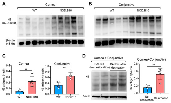 H2 antigen expression in the cornea and conjunctiva in two murine DED models. (A,B) Western blot images for H2 antigen in the cornea (A) and conjunctiva (B) in wild-type (WT) C57BL/6 and NOD.B10.H2b (NOD.B10) mice at 12 weeks of age. (C) Densitometric analysis of the ratio of H2 antigen expression relative to β actin. (D) Representative Western blot image and quantitative densitometric analysis of H2 antigen in the cornea and conjunctiva in 30-week-old BALB/c mice under physiological condition (without desiccating stress) or under desiccating stress. A circle represents the data from a single individual animal. Bar depicts mean ± SD. ** p < 0.01.