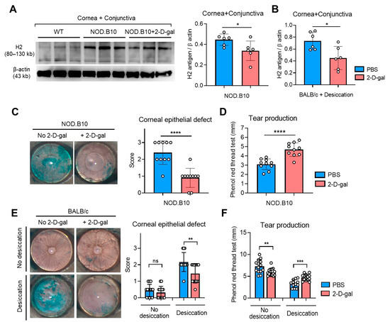 Intraperitoneal (IP) administration of 2-D-gal significantly decreased H2 antigen levels in the cornea and conjunctiva (Figure 2A,B). Along with decreased H2 antigen, corneal epithelial defects were significantly reduced, and tear production was increased by 2-D-gal both in NOD.B10.H2b mice and in BALB/c mice subjected to desiccating stress (Figure 2C–F). Of note, 2-D-gal treatment rather decreased tear production, while not affecting corneal epithelial defects, in normal BALB/c mice without desiccating stress (Figure 2E,F), which suggested a differential role of α(1,2)-fucosylation at the ocular surface depending on physiologic or pathologic conditions.