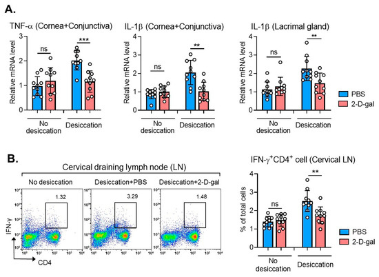 Effects of 2-D-gal on immune response at the ocular surface in DED. (A) Real-time RT-PCR analysis for TNF-α and IL-1β in the cornea and conjunctiva or in the lacrimal gland in BALB/c mice under physiological condition (no desiccating stress) or desiccating stress with or without 2-D-gal treatment. Shown are the relative mRNA levels to normal BALB/c mice (no desiccation, no 2-D-gal). (B) Representative and quantitative flow cytometry results for IFN-γ+CD4+ Th1 cells in cervical draining lymph nodes (LN). Shown are the percentages of IFN-γ+CD4+ cells out of total LN cells. A circle represents the data (mean ± SD) from an individual animal. ** p < 0.01, *** p < 0.001, ns: not significant.