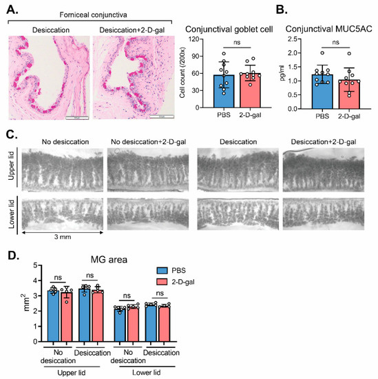 Effects of 2-D-gal on conjunctival goblet cell and meibomian gland of the eyelid. (A) Representative images of periodic acid–Schiff (PAS) staining of the inferior conjunctival fornix (sagittal section; scale bar: 100 μm) and quantification of PAS-stained goblet cell counts in BALB/c mice under desiccating stress with or without 2-D-gal treatment. (B) ELISA for conjunctival MUC5AC. (C) Representative transillumination meibography images. (D) Quantification of the meibomian gland area of the upper and lower eyelids. A circle depicts data (mean ± SD) from a single individual animal. ns: not significant.
