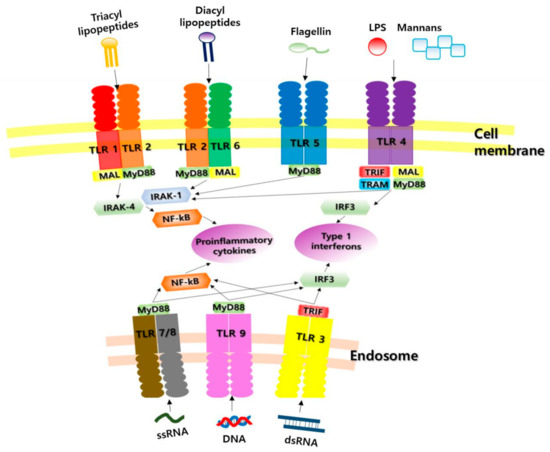 TLRs detect bacteria, viruses, fungi and protozoa, triggering an innate immune response as described above. Microbial products capable of stimulating TLR signals include lipopolysaccharides (LPS) from Gram-negative bacteria, peptidoglycans from Gram-positive bacteria, bacterial lipoprotein, lipoteichoic acid, lipo-arabinomannan, zymosan, bacterial ciliated protein (flagellin), fusion protein from respiratory syncytial virus, non-methylated CpG nucleotides, double-stranded RNAs (dsRNAs) and single-stranded RNAs (ssRNAs), among others. If there is a TLR deficiency, these pathogens are not recognized, leading to various infectious immune diseases. Each TLR recognizes a different PAMP depending on where it is localized. TLR1, -2, -4, -5, and -6 are present on the cell surface, and thus detect extracellular PAMPs, whereas TLR3, -7, -8, and -9 are present in the cytosol and endosome membranes, and thus detect intracellular PAMPs. TLR3 recognizes viral dsRNA; TLR4 recognizes bacterial LPS; TLR5 recognizes flagella; TLR7/8 recognize ssRNA; TLR9 recognizes dsDNA; TLR3, -7, -8, and -9 recognize viral nucleic acid; and TLR2 and 4 recognize viral protein [12,17,18,19] (Table 1, Figure 1).