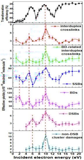 The upper frame is the complement of the transformation efficiency of JM109 E. coli cells, containing PGEM3Zf(−) plasmids bombarded with LEEs of 0.5 to 21 eV []. It is compared to the single-electron yields of interduplex and BD-related interduplex crosslinks, SSBs, BDs, DSBs, and non-DSB clustered damage, recorded as a function of electron energy. The dotted lines indicate the energies of TAs at 2, 5, 6, and 10 eV.