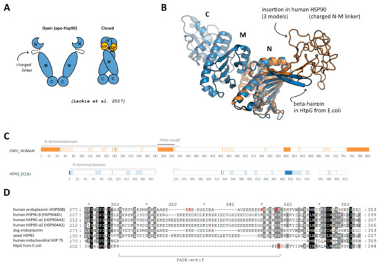 (A) Schematic representation of open and closed forms of HSP90, adopted from [18]. (B) Location of disordered insertion of PASK-motif in beta-hairpin in N-terminal domain of human endoplasmin (orange) compared to “short” beta-hairpin of bacterial HSP90 (blue); three different initial models are superimposed; middle and C-terminal domains of human endoplasmin are not shown. (C) Disordered regions predicted using DISOPRED3 [19] (bright orange/blue) and PONDR [20] (light orange/blue). (D) Alignment of the region of the beta-hairpin with the insertion and PASK-motif; reconstructed using Clustal Omega.