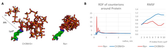 (A) Typical states of LysP-PPi chain for 50–100 ns (every 10 ns): stable position in case of Na+ and dynamic state in case of CH3NH3+; (B) radial distribution function (RDF) graphs for counterions and mobility of PPi residues (in terms of root mean square fluctuation, RMSF).
