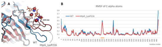 A study of the effect of polyphosphorylation on protein behavior was started from the modeling of bacterial HSP90, namely, HtpG from E. coli. Lys216 residue located in the mentioned above beta-hairpin was polyphosphorylated. It resulted in some rearrangement of the beta-hairpin and formation of new contacts (Figure 3A). Thus, the charged residues located in the beta-hairpin (Lys212, Glu214, Glu225, Lys226 and others) formed ion pairs with polyphosphate chain or with methylammonium cations bound to polyphosphate chain. However, the structure of N-terminal domain of HtpG was not affected. Polyphosphorylation also did not induce any significant changes in the beta-hairpin flexibility (Figure 3B).