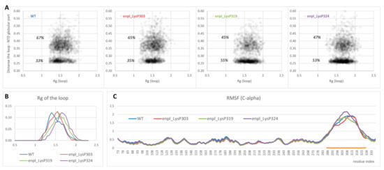 Polyphosphorylation caused some expanding of the disordered loop: the radius of gyration of the loop increased in all polyphosphorylated forms compared to the native from (Figure 5B). It was true for both sets of conformations, interacting with the globular part and non-interacting ones (compare density of points with Rg < 1.5 and Rg > 1.5 in Figure 5A). Effect of polyphosphorylation at Lys319 and 324 was more pronounced compared to modification at Lys303.