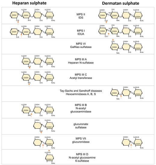 Apart from different DS/HS ratios, MPS I and MPS II present different degradation products of both GAGs [68]. These differences stem from the position of IDS and IDUA in the GAG degradation pathway, respectively (Figure 1).