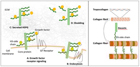 Examples of the biological functions of DS- and HS-containing proteoglycans. (Left panel) HSPGs affect growth factors and morphogens in a number of ways that are dependent on their sulfation pattern, their cellular localization, and the core protein [76]. HSPGs can be tethered to the cell surface (syndecan and glypicans), where they retain growth factors and activate receptor signaling (A), or mediate clearance of growth factors by endocytosis of growth factors and their receptors (B). HSPGs promote and stabilize the ternary complex between the growth factor, HS, and growth factor receptor. The formation of the ternary complex is enhanced by higher sulfation levels. Other HSPGs (perlecan and agrin) are secreted and localized in the ECM, where they can trap growth factors, and thus generate growth factor reservoirs and prevent their diffusion (C). HSPGs and HS can also be released by shedding, and thus become soluble (D). Soluble HSPGs can facilitate growth factor dispersal or movement through the extracellular space. (Right panel) During collagen fibrillogenesis, procollagen is synthesized as a triple helix that self-assembles into striated collagen fibrils after cleavage of the C- and N-terminal propeptides. The collagen fibrils are then arranged into uniform collagen fibers. The precise spacings between collagen fibers are maintained by the DS-containing proteoglycan decorin.
