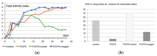 - Dranguet, V.J.; Fraga, A.; Diaz, M.T.; Mallok, A.; Viebahn-Hänsler, R.; Fahmy, Z.; Barbera, A.; Delgado, L.; Menendez, S.; Leon, F.O.S. Ozone oxidative postconditioning ameliorates joint damage and decreases proinflammatory cytokine levels and oxidative stress in PG/PS-induced arthritis in rats. Eur. J. Pharmacol. 2013, 714, 318–324. [Google Scholar] [CrossRef]
