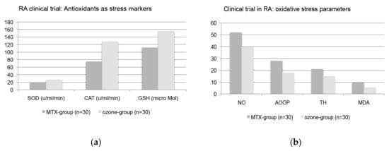 - León, F.O.S.; Viebahn-Haensler, R.; López, C.G.; Serrano, E.I.; Hernández, M.Y.; Delgado, R.L.; Tamargo, S.B.; Takon, O.G.; Polo, V.J.C. Medical ozone increases methotrexate clinical response and improves cellular redox balance in patients with rheumatoid arthritis. Eur. J. Pharmacol. 2016, 789, 313–318. [Google Scholar] [CrossRef]