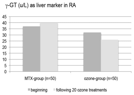 - Takon, O.G.; Viebahn-Haensler, R.; López, C.G.; Serrano, E.I.; Tamargo, S.B.; Polo, V.J.C.; Sánchez, S.S.; León, F.O.S. Medical Ozone Reduces the Risk of GGT and Alkaline Phosphatase Abnormalities and Oxidative Stress in Rheumatoid Arthritis Patients treated with Methotrexate. SMJ. Arthritis Res. 2017, 1, 1004. [Google Scholar]