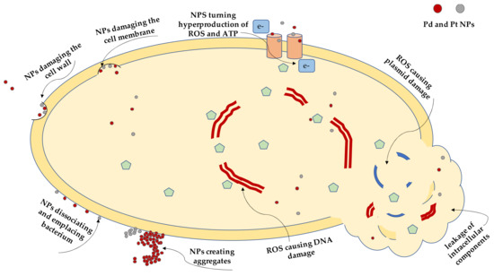 A schematic illustration of possible mechanism of action of palladium nanoparticles (PdNPs) and platinum nanoparticles (PtNPs) on a bacterial cell and its components.