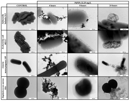 TEM visualization of the interactions between palladium nanoparticles (PdNPs) and planktonic cells of S. Infantis S13, E. coli 683/17, L. monocytogenes 149 and S. aureus 816 after 4, 8 and 24 h exposure.