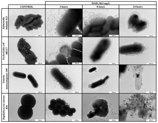 TEM visualization of the interactions between platinum nanoparticles (PtNPs) and planktonic cells of S. Infantis S13, E. coli 683/17, L. monocytogenes 149 and S. aureus 816 after 4, 8 and 24 h exposure.