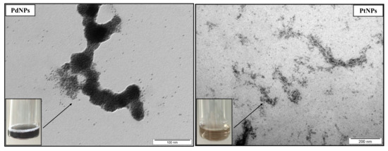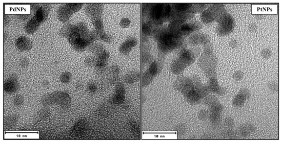 TEM images of palladium nanoparticles (PdNPs) and platinum nanoparticles (PtNPs).