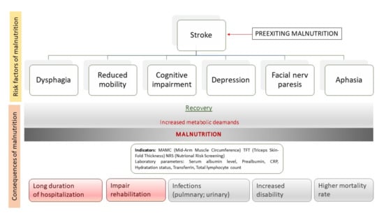 - Sabbouh, T.; Torbey, M.T. Malnutrition in Stroke Patients: Risk Factors, Assessment, and Management. Neurocrit. Care 2017, 29, 374–384. [Google Scholar] [CrossRef]