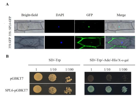 2.2. SmSPL6 Is Located in the Nucleus and Is Involved in Transcriptional Activation