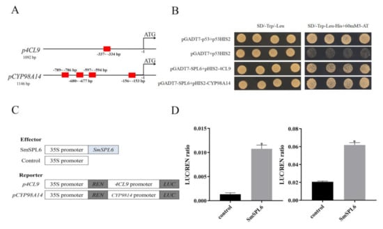 2.6. SmSPL6 Binds Directly to the Promoter of SmCYP98A14 and Sm4CL9