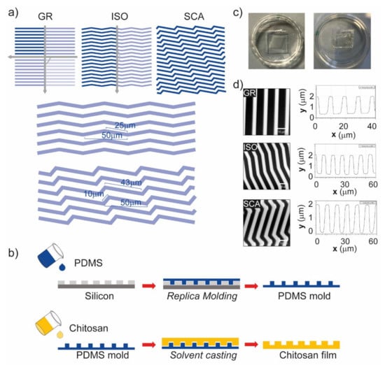 Chitosan membranes were microfabricated and patterned with anisotropic topographies with different levels of axial symmetry by solvent casting on PDMS intermediate molds. First of all, the patterns were written on a negative resist layer (3 μm thick) spun on a silicon wafer by laser lithography, which reads a CAD file and transfers the pattern onto the photosensitive resist using a laser. Different directional grooved patterns were designed, all based on a period (i.e., the width of a ridge and a groove) of 10 µm, with 4 µm ridges and 6 µm grooves, and a depth of ~1.6 µm. These dimensions were chosen to obtain a contact guidance mode (i.e., features with a shorter period than the cell body diameter) of interaction between the substrates and cells, according to our previous work []. The following directional micropatterns were developed, with different levels of symmetry (Figure 1a): a grating pattern (GR), with two symmetry axes; a zigzag pattern with isosceles triangles (ISO), with one symmetry axis; and a zigzag pattern with scalene triangles (SCA), with no symmetry axis. Regarding the triangle dimensions (side length and angles), we chose to use a linear dimension for the base of the triangles of 50 µm and an angle of 10° for both the ISO and SCA (minor angle). These values were chosen as the polarized cell somas (i.e., ≈40–50 µm long on micropatterns) can sense a full topographical feature (a triangle), and the triangles that originated were not too narrow, nor were the sides too transversal in respect to the main direction of the pattern, respectively.