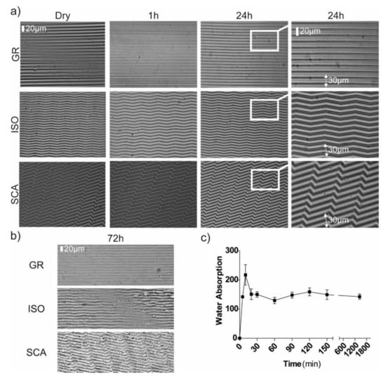 Chitosan microstructured membranes. (a,b) Optical microscope images of chitosan micropatterned membranes for the three patterns: GR, ISO, and SCA. (a) In a dry state (first column) and, after neutralization, in a liquid (water) environment for 1 h (second column) and 24 h (third–fourth columns). Scale bar = 20 μm. (b) GR, ISO and SCA membranes after 72 h in the cell culture conditions. Scale bar = 20 μm. (c) Water absorption of the microstructured chitosan films at different times after immersion in water. Data = mean ± SD, n = 5.