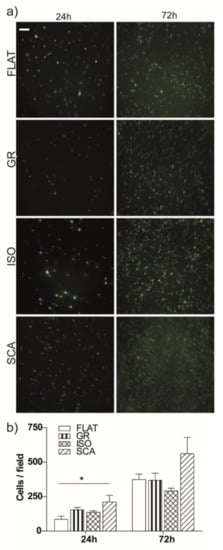 RT4-Schwann cell proliferation. (a) Fluorescence microscopy images of RT4-SCs at t = 24 h and t = 72 h, on FLAT, GR, ISO and SCA chitosan membranes. The nuclei are visible in green (GFP). Scale bar = 70 µm. (b) The proliferation rate of RT4-SCs on GR, ISO and SCA micro-structured membranes and on the FLAT control, reported as cells/field at t = 24 and 72 h. As a comparison, we report that the number of RT4-SCs on the standard cell plates (seeded in parallel and in the same conditions as the chitosan films) was 183.3 ± 63.9 cells/field at 24 h. * p < 0.05, one-way ANOVA, Bonferroni’s test. Data = mean ± SEM, n = 3.