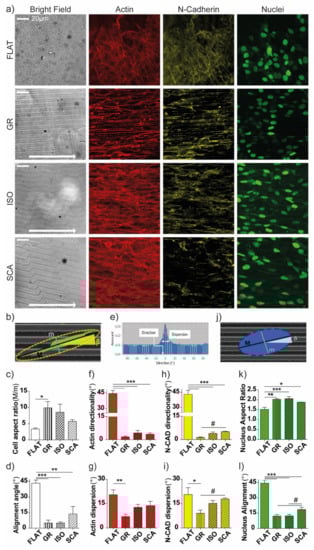 The N-Cad expression pattern, as a marker of cell–cell contact, was then analyzed using the same method presented for the actin. The localization of the N-Cad developed was oriented and aligned to the main axis of the topographies, while it appeared to be randomly organized on the FLAT. We found that all of the directional patterns (GR, ISO and SCA) guided the N-Cad orientation (p < 0.001 FLAT vs. GR/ISO/SCA, Figure 4h) for the cytoskeleton fibers’ organization. Regarding the dispersion of the N-Cad signal, only GR highly polarized the N-Cad signal, and no significant differences between the asymmetric ISO and SCA patterns emerged with respect to the isotropic FLAT substrate (Figure 4i). In particular, the dispersion of the N-Cad signal was significantly higher on the SCA with respect to the GR (p < 0.05 GR vs. SCA).