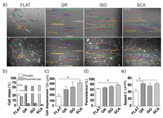 The ability of SCs to migrate along the chitosan patterns was assessed first by single-cell migration experiments. RT4-SCs were cultured on FLAT, GR, ISO and SCA chitosan films, and their motion was tracked for 20 h by time-lapse microscopy (Figure 5a). The RT4 cells migrated parallel to the main axes of all of the topographies, whereas they maintained a random walk on the FLAT membranes. The percentage of parallel steps increased in all of the chitosan patterns (Figure 5b), from 22 ± 1% for FLAT (for a random motion with an arbitrary reference direction, the percentage of the aligned steps would theoretically be 20%) to 60 ± 2% for GR, 57 ± 3% for ISO and 62 ± 2% for SCA (p < 0.001 all vs. FLAT). Conversely, there was a decrease in the quantity of perpendicular steps below 5% on all of the patterns (p < 0.001 all vs. FLAT; Figure 5b, grey columns). The decrease of symmetry in the substrate topography had a positive impact on the total displacement of the cells, as taken after 15 h of migration (Figure 5c). Generally, the topographies had a positive effect on the final displacement, which originated by the anisotropic directional migration along the patterns, and interestingly the cells on the SCA had the highest displacement (422 ± 46 µm; p < 0.05 SCA vs. FLAT). Indeed, the distance travelled showed an increasing trend proportional to the increase of the asymmetry in the pattern.