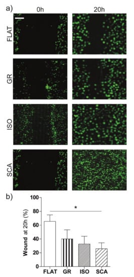We then performed wound-healing experiments, in order to observe how a uniform monolayer of RT4-SCs migrate on the differently symmetrical directional patterns. These experiments consisted in the generation of a cell-free area (a wound, placed perpendicular to the pattern direction) surrounded by a monolayer of cells, in order to measure the ability of the cells to re-colonize this gap and, eventually, the completely close the wound (Figure 6a). The cell migration was then observed via time-lapse microscopy, and the wound area at t = 20 h was analyzed and reported as the percentage of the wound area present in respect to the initial (t = 0) wound area. The initial gap mean width was 363 ± 34 µm for GR, 379 ± 48 µm for ISO, 410 ± 39 µm for SCA and 396 ± 28 µm for FLAT, thus ensuring the same starting conditions for all of the patterns.