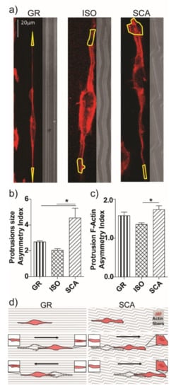 Similarly, it happened to RT4-SCs on ISO. The symmetry of the two cytoplasmic protrusions was, instead, limited on the cells growing on SCA, where one cell end was consistently larger than the other: this asymmetry led to an increase in the area ratio between the two protrusion edges (p < 0.05 SCA vs. ISO and GR; Figure 7b).
