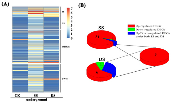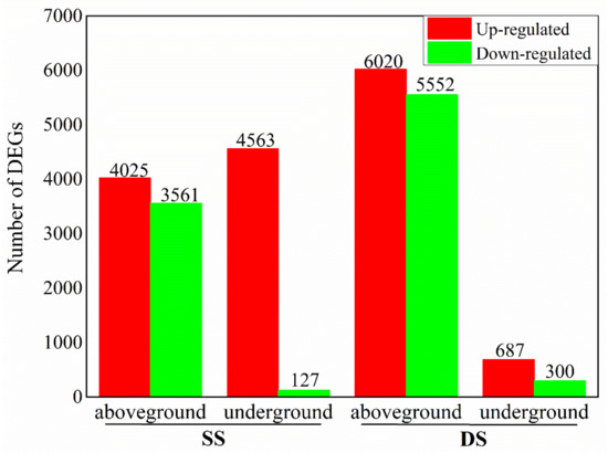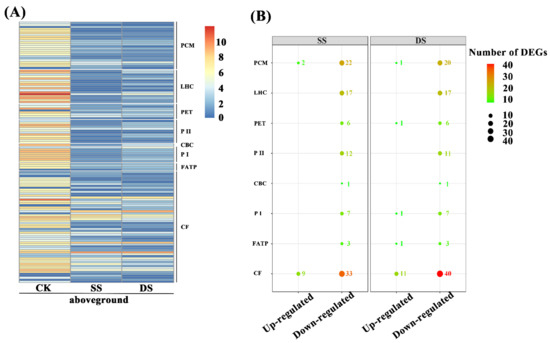 3.1. Modulation of Photosynthetic Pathways under SS and DS