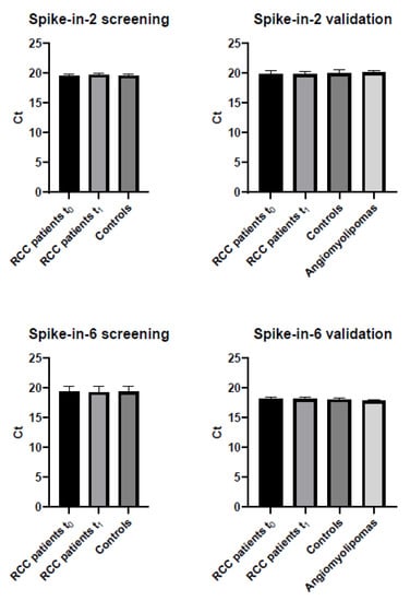 Differences in expression levels of the synthetic spike-in RNAs among the study groups. Spike-in 2 monitors the RNA isolation step and spike-in 6 monitors the retrotranscription efficiency. Expression levels are represented as Ct values and error bars represent standard deviation. ANOVA p > 0.05.
