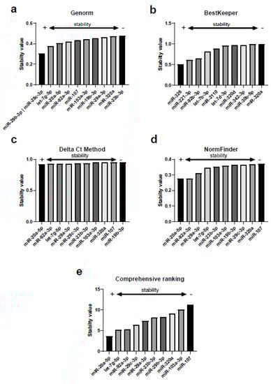 Selection of candidate miRNA normalizers and analysis of their stability conducted with the comprehensive tool RefFinder. Each graph represents the best 10 reference miRNAs selected by each algorithm: (a) Genorm, (b) BestKeeper, (c) Delta Ct method, (d) NormFinder and (e) Comprehensive raking. The lower the stability value, the higher the stability of each miRNA.