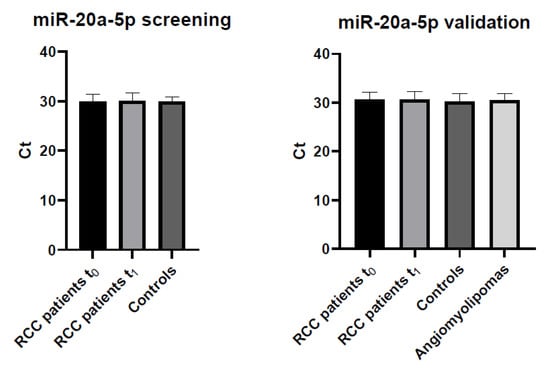 A crucial characteristic of a good normalizer is the stable expression among the study groups analyzed. Accordingly, we compared the mean Ct values of the most stable miRNA proposed by the comprehensive ranking among the study subjects. As seen in Figure 3, no differences were observed in the expression of miR-20a-5p between RCC patients and controls studied in the screening or validation cohorts, or with angiomyolipomas (ANOVA p > 0.05). This observation, together with its good expression level (mean of the Ct values = 29.97), made miR-20a-5p as the best normalizer for our study.