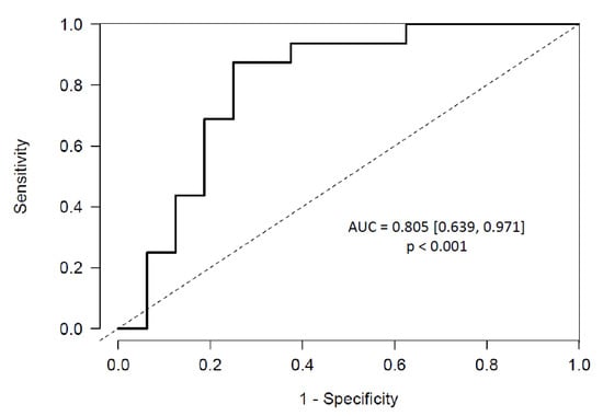 The effect of each miRNA was stated as standardized odds ratios (ORs), reporting an increase of one standard deviation in the miRNA expression level. Accordingly, miR-200a-3p had standardized ORs of 1.01, miR-34a-5p of 1.15 and miR-365a-3p of 1.28, respectively. With this predictive model we achieved an area under the ROC curve (AUC) of 0.805 (Confidence Interval, CI 95% [0.639, 0.971], p < 0.001) (Figure 4).