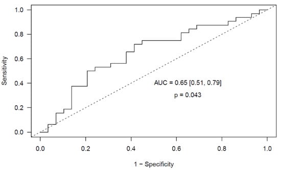 In the validation stage, we analyzed the expression of these three miRNAs in an independent cohort of ccRCC patients and we validated the predictive model achieving an AUC of 0.65 (95% CI [0.51, 0.79], p = 0.043) (Figure 5).