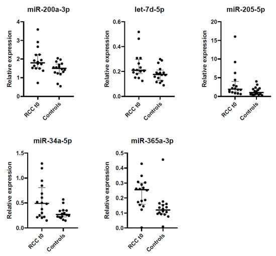 Relative expression of the five dysregulated miRNAs (miR-200a-3p, let-7d-5p, miR-205-5p, miR-34a-5p and miR-365a-3p) in ccRCC patients before surgery (t0) compared to controls.