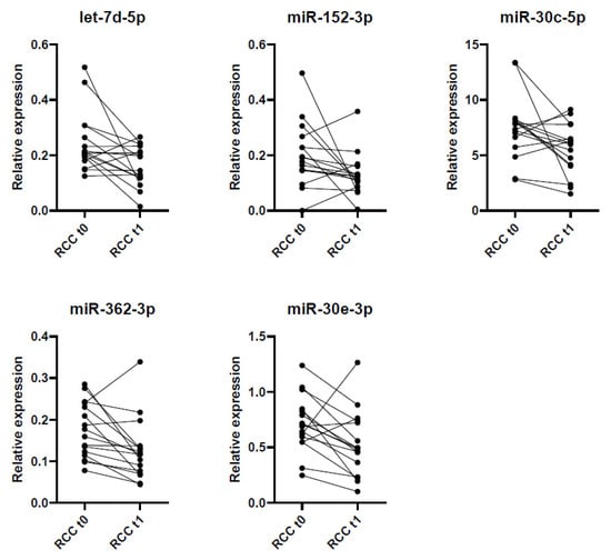 In addition, we identified those miRNAs dysregulated before (t0) and fourteen weeks after surgery (t1) in the cohort of ccRCC patients of the screening stage with the paired Wilcoxon test. Fold-change expresses the ratio of the average expression level of a miRNA in t0 and t1. We identified five dysregulated miRNAs: let-7d-5p (FC = 1.53, p = 0.046), miR-152-3p (FC = 1.57, p = 0.023), miR-30c-5p (FC = 1.35, p = 0.042), miR-362-3p (FC = 1.37, p = 0.03) and miR-30e-3p (FC = 1.31, p = 0.048) (Figure 7). Importantly, a strong correlation was observed among most dysregulated miRNAs before and after surgery in ccRCC patients (Table 3).