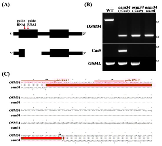 In order to elucidate the function of osmotin genes in the regulation of ABA signal transduction, we investigated two genetic mutants of Arabidopsis: OSMOTIN 34 (OSM34) (AT4G11650) and OSMOTIN 34-LIKE (OSML) (AT1G77700). OSML (AT1G77700) was selected based on the amino acid sequence similarities (Supplementary Figure S1). Since no knockout mutant of OSM34 was available from public sites, we applied the CRISPR/Cas9 approach to generate a deletion mutant, osm34. By introducing two guide RNAs targeting two independent sites in the first exon of OSM34 (Figure 1A), a deletion mutant of OSM34 (osm34) was isolated and found to have a 413 bp deletion (Figure 1B,C). osm34 revealed PCR bands with a shorter length in different tissues and in subsequent generations (data not shown). To minimize the putative off-target effect by Cas9 [], a Cas9-free osm34 was generated by crossing osm34 into the wild-type (Col-0) control (Figure 1B).