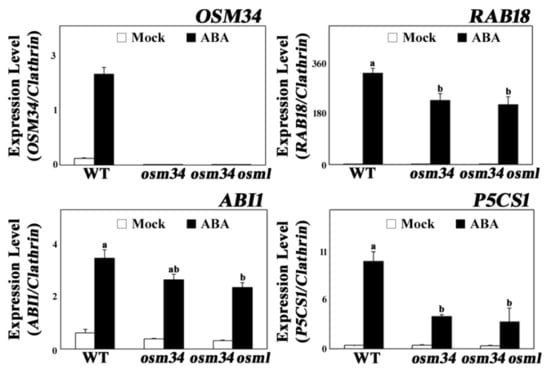 The mutants osm34 and osm34 osml exhibit reduced ABA induction of gene expression Six-day-old seedlings were treated with 50 μM ABA for 24 h and used for quantitative PCR analyses. Clathrin was used as an internal control. a/b/ab indicate different groups according to one-way ANOVA Duncan post-hoc test (p < 0.05).
