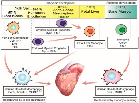 For years macrophages were thought to develop exclusively from circulating monocytes that infiltrated tissues in the presence or absence of inflammation and became tissue-resident macrophages [3,4]. As we have learned more about the heterogeneity and lineages of macrophages, we now know that, in addition to monocyte-derived macrophages, many tissue-resident macrophage populations develop prior to the onset of hematopoiesis. These subpopulations of tissue-resident macrophages are broadly distributed throughout virtually all tissues during homeostasis and first appear during early embryogenesis [5,6,7,8]. Tissue-resident macrophages are defined as macrophages that perform homeostatic functions and reside in the tissue in the absence of injury or inflammation, and either arise independent of monocyte lineage and hematopoiesis, or are seeded from circulating monocytes. New research tools that look at macrophages at the transcriptomic or proteomic level, have unveiled the heterogeneity of these tissue-resident cells, describing how they exist as clusters of subpopulations with distinct and overlapping functions [9,10,11,12,13]. These cells perform constant surveillance and phagocytosis of foreign and deleterious cells and material that may alter the normal function of their microenvironment [8,14,15,16,17,18,19,20,21,22]. Examples of tissue-resident macrophages include Kupffer cells found in the liver and microglia located throughout the brain, as well as peritoneal, lung, splenic red pulp, and bone marrow (BM) macrophages [5,6,7,8,18,22]. Relatively recent research demonstrates the importance of embryonic and monocyte-derived cardiac-resident macrophages in cardiac homeostasis and after cardiac injury, beyond their phagocytic capacity. Here, we present a detailed review of the literature describing the ontogeny, development, characterization, and role of cardiac-resident macrophages in both homeostasis and after injury.