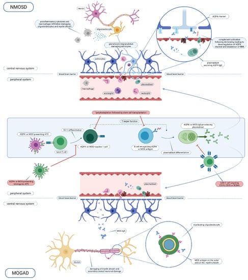 Both NMOSD and MOGAD are autoimmune central nervous system (CNS) disorders, which share, in part, clinical presentations, but differ in immunopathogenesis and pathological characteristics [22]. In this section, a comprehensive insight into the pathogenesis of both diseases will be given. For a graphical overview, including intervention points for cell therapy, we refer to Figure 1.