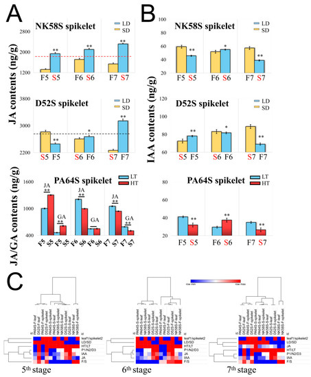 Analysis of hormone contents in D52S, NK58S and PA64S by photoperiod and temperature treatment. (A) JA and GA contents of spikelets from D52S, NK58S and PA64S treated by LD/SD and HT/LT. (B) IAA contents of spikelets from D52S, NK58S and PA64S. (C) Heatmap analysis of their hormone contents from 5th to 7th stages. The contents from HT/LT and LD/SD treated plants are columnar with red/blue and blue/yellow color, respectively. Data are shown as mean ± standard deviation (n = 3). Asterisks indicate significant differences between sterile and fertile plants revealed by Student’s t-test (*, p < 0.05; **, p < 0.01) for each line at the same stages. LD, long-day cycle; SD, short-day cycle; HT, high temperature; LT, low temperature; S/F, sterile/fertile plants; 5/6/7, 5th/6th/7th-stage; JA, jasmonic acid; IAA, indole-3-acetic acid; GA, gibberellin.