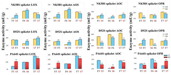 For PA64S, D52S and NK58S, the activities of key enzymes in the JA biosynthetic process were analyzed in the spikelets and sword leaves of the sterile and fertile plants of each line in the 5th–7th stages under the temperature, photoperiod and spraying treatments.