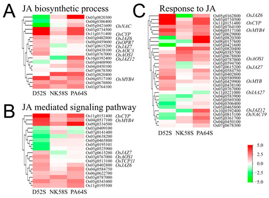 Heatmap analysis of gene expressions in JA biosynthetic process (A), JA signaling pathway (B) and response to JA (C) in 4th-stage-florets of PA64S, D52S and NK58S. Data are normalized and transformed by log2FC of gene expression in fertile plants, compared to those in sterile plants (n = 3). FC, fold change; S/F, sterile/fertile plants.