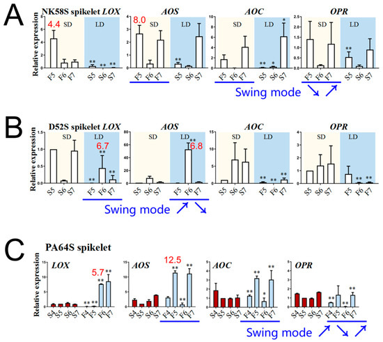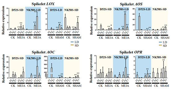 Further, we searched specifically for the corresponding genes involved in the JA biosynthetic process, including OsLOX, OsAOS1, OsAOC3 and OsOPR7, in the young spikelets and sword leaves of the plants in which fertility reversal was induced by the spraying treatments. As shown, the expression of these genes in NK58S and D52S leaves was obviously regulated by spraying, and the long-term response to spraying, particularly that in OsAOS1, OsAOC3 and OsOPR7 in leaves, was upregulated by MEJA spraying or downregulated by SHAM spraying (Figure S10). Notably, spikelet OsAOS1 and OsAOC3 expression during the 6th stage was upregulated 30–50-fold and 20–500-fold, respectively, in the fertile lines compared to the sterile lines by MEJA spraying and by photoperiod fertility induction (Figure 6).