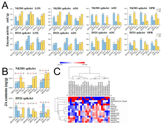 Analysis of JA synthesis enzyme activities and contents in D52S and NK58S by MEJA/SHAM-spraying treatment. The enzyme activities of LOX, AOS, AOC and OPR in the spikelets from NK58S and D52S (A), the JA contents (B), and heatmap analysis (C) are also listed. The LD/SD treated plants are columnar with blue/yellow color, respectively, and the spraying plants were named CK/MEJA/SHAM in the X-axis. The reversed-fertility plants are marked with arrows. The data homogenization for heatmap analysis are treated with maximum and minimum values of each indicator marked in red to blue. Data are shown as mean ± standard deviation (n = 3). Asterisks indicate significant differences of enzyme activities between spraying-induced reversed-fertility plants and those in the control group revealed by Student’s t-test (**, p < 0.01). LD, long-day cycle; SD, short-day cycle; MEJA, methyl jasmonate; SHAM, salicylhydroxamic acid; CK, control; S/F/R, sterile/fertile/fertility-reverse plants; 5/6/7, 5th/6th/7th-stage.