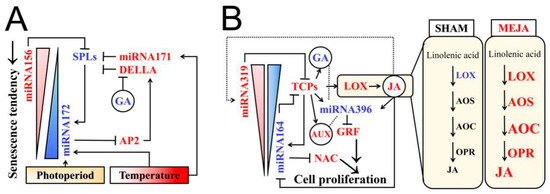 Interaction pattern between miRNA and phytohormone regulating pollen fertility in PTGMS and PGMS. (A) Work pattern of GA and miRNA156-miRNA172 in senescence mechanism. (B) Crosstalk pattern of JA, IAA, GA and miRNA164-miRNA319 in cell proliferation mechanism. Compared to those in sterile plants, miRNAs and their target genes downregulated/upregulated in fertile spikelets are marked in blue/red color according to our previous results of PA64S [46]. For spray treatment of PGMS, gene expressions of JA synthesis downregulated/upregulated in fertile NK58S and D52S spikelets are marked in blue/red color, according to data in Figure 5 and Figure 6.