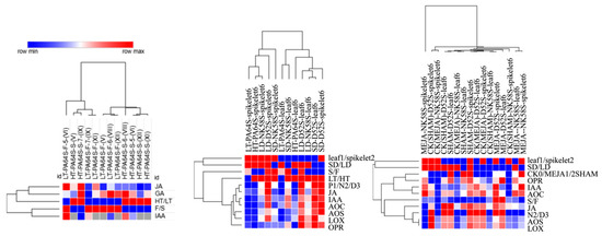Heatmap analysis of hormone contents and JA synthesis enzyme activities in D52S, NK58S and PA64S. Data are from Figure 1, Figure 2 and Figure 5, and are treated for homogenization with maximum and minimum values of each indicator marked in red to blue. LD, long-day cycle; SD, short-day cycle; HT, high temperature; LT, low temperature; MEJA, methyl jasmonate; SHAM, salicylhydroxamic acid; CK, control; S/F/R, sterile/fertile/fertility-reverse plants; 5/6/7, 5th/6th/7th-stage.