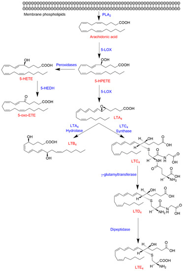 Early studies on LT biosynthesis date back to the 1970s when Samuelsson and Borgeat described the formation of 5S-hydroxyeicosatetraenoic acid (5S-HETE) together with new arachidonate metabolites that were later termed LTA4 and LTB4 in peripheral leukocytes [20,21]. These investigations established a novel pathway of oxidative transformation of AA catalyzed by 5-LOX.