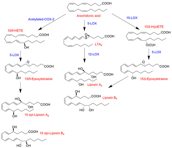 The formation of lipoxins (lipoxygenase interaction products; LXs) is another paradigmatic example of transcellular biosynthesis (Figure 2). Synthesis of LXs requires the combination of different cell types (i.e., neutrophils, endothelial cells, and(or) platelets) expressing different lipoxygenases (i.e., 5-LOX, 12-LOX and(or) 15-LOX) [32]. For example, the tandem interaction of 5-LOX- and 12-LOX-expressing cells (i.e., neutrophils and platelets, respectively) leads to the formation of LXA4 from LTA4 [33,34]. Another transcellular mechanism of LX biosynthesis involves the interaction of 15-LOX (monocytes/macrophages and epithelial cells) and 5-LOX, resulting in the sequential transformation of AA to 15S-HPETE followed by the conversion by 5-LOX to yield LXA4 and LXB4 [35]. The synthesis of LXs is not limited to the interaction of only lipoxygenases. Acetylated COX-2 retains catalytic activity, forming 15R-HETE as the primary product [36,37], which can serve as a substrate for 5-LOX producing the aspirin-triggered LXs (LXA4 and LXB4 epimers) known as 15-epi-LXA4 and 15-epi-LXB4 [22,38,39]. LXs and aspirin-triggered LXs have anti-inflammatory properties promoting the resolution of inflammation [40,41,42], which contrasts with the largely pro-inflammatory effects of other products of the 5-LOX pathway.